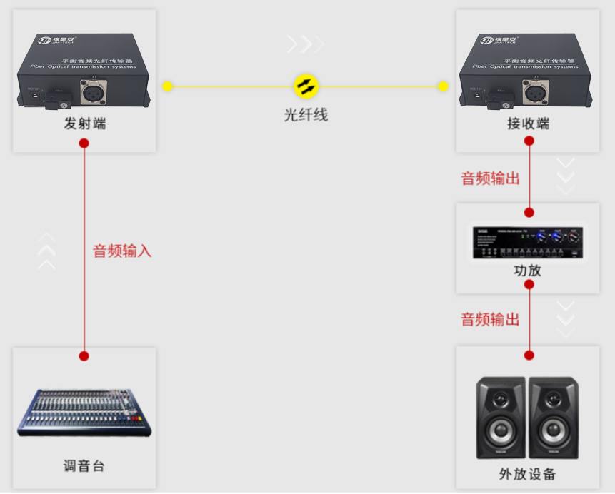 JHA-DCN1A该产品是一种把传统三芯模拟音频通过发射机转换为光信号通过光纤传输,接收机接收信号再次转换为三芯模拟音频的一种光纤长距离传输设备。前端平衡音频信号直接输入,经过光纤传输从后端输出接有源音箱或者接功放驱动喇叭。采用16bit数字音频编码,系统指标达到或超过广播甲级标准。它具有传输距离远,抗干扰性强,无衰减等很多优点因此在现场环境中被大量弱电工程商使用。