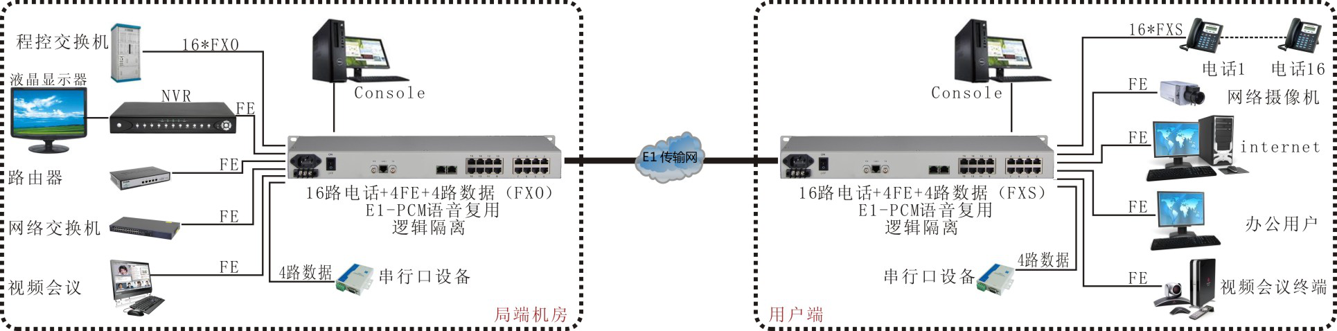 16路PCM+4FE+4路数据+Console管理(逻辑隔离)E1语音复用