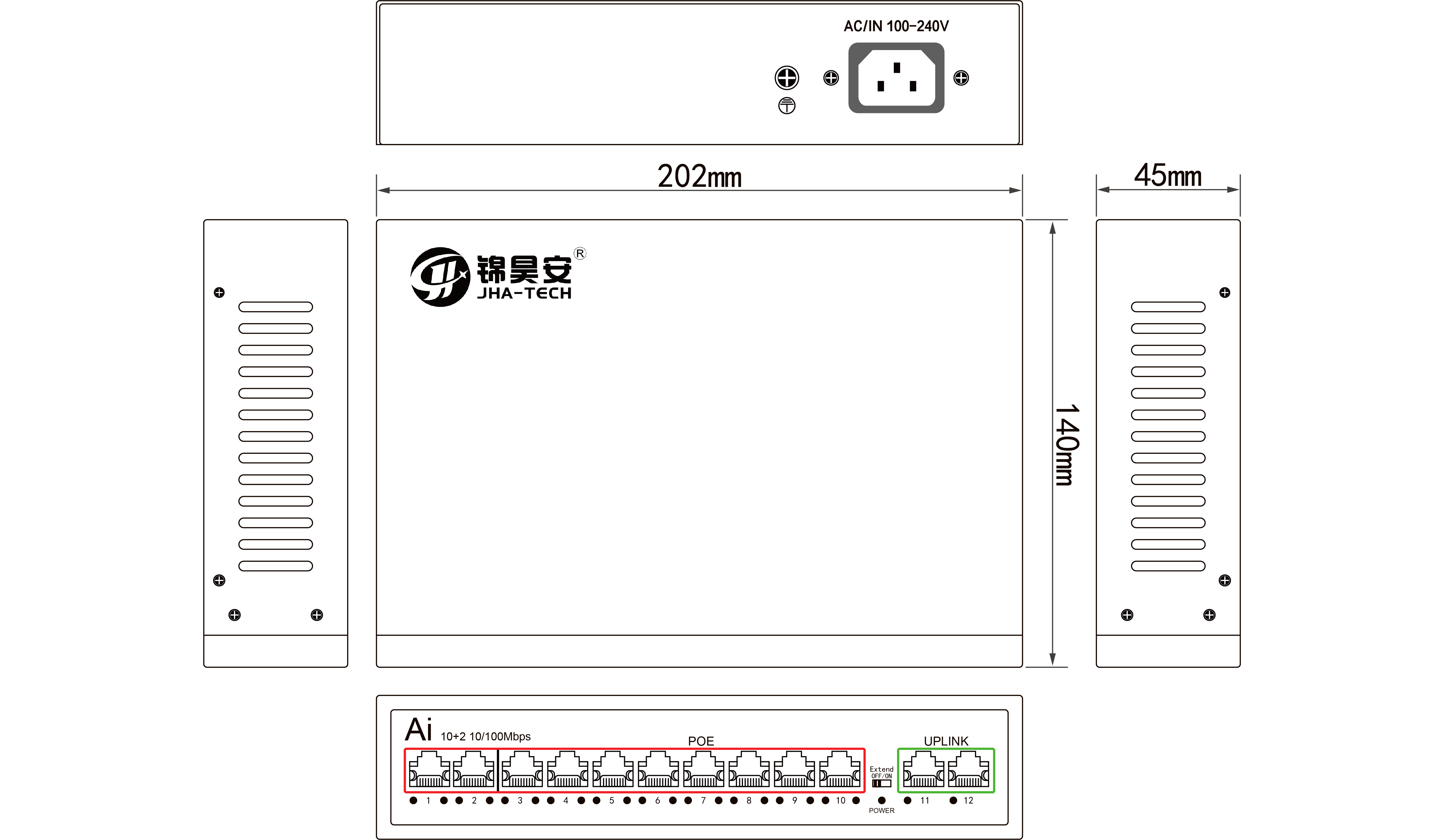JHA-P10210CBMH款PoE交换机是8188www威尼斯专为满足PoE供电需求而自主创新研发设计,采用最新高速以太网交换芯片,超高背板带宽设计,拥有极速数据处理能力,提高流畅的数据传输性能。具有10个百兆POE供电RJ45端口,2个百兆RJ45支持端口上联。其中10个RJ45端口全部支持IEEE 802.3af/at标准PoE供电,单口最大供电功率达30W,整机最大120W。能自动检测识别符合IEEE 802.3af/at标准的受电设备,并通过网线为优先机制供电。