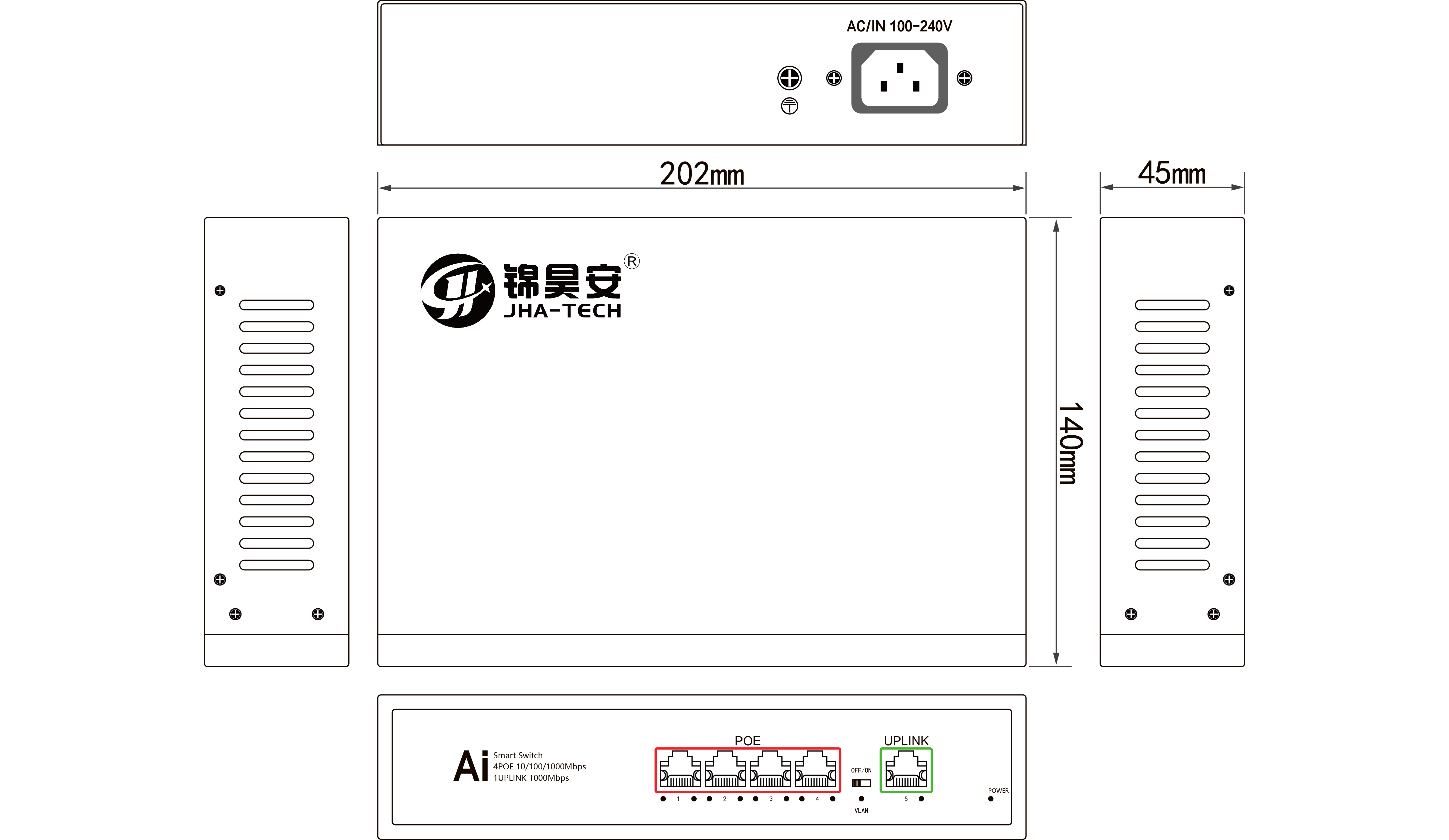 JHA-P40104BMH系POE交换机是8188www威尼斯专为满足PoE供电需求而自主创新研发设计,采用最新高速以太网交换芯片,超高背板带宽设计,拥有极速数据处理能力,提高流畅的数据传输。具有4个千兆POE供电RJ45端口、1个千兆RJ45上联端口。其中4个RJ45端口全部支持IEEE 802.3af/at标准PoE供电,单口最大供电功率达30W,整机最大72W。能自动